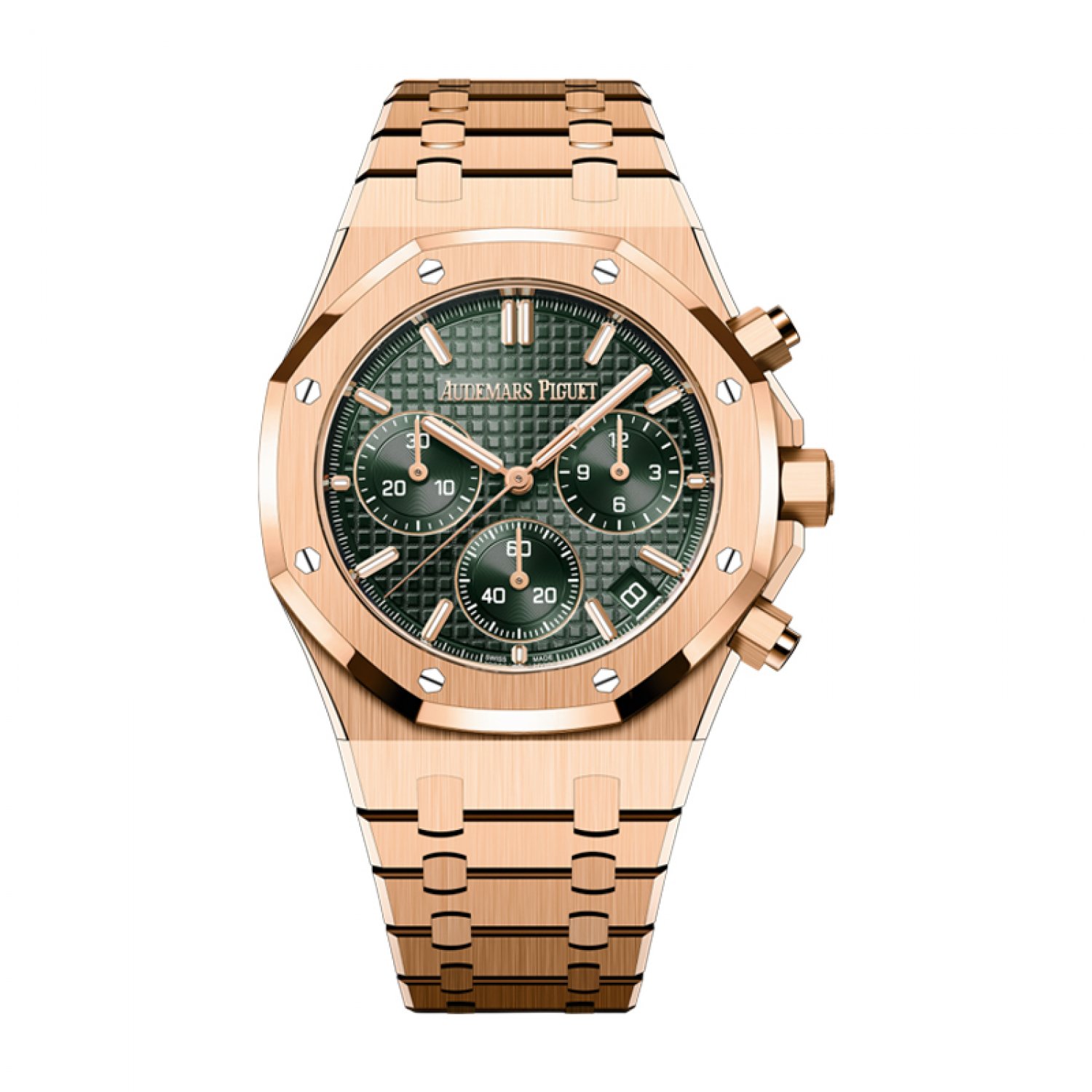 Mặt số màu kaki màu xanh lá cây với hoa văn “Grande Tapisserie”, mặt số màu kaki màu xanh lá cây, vạch chỉ giờ bằng vàng hồng và kim Royal Oak có lớp phủ phát quang.