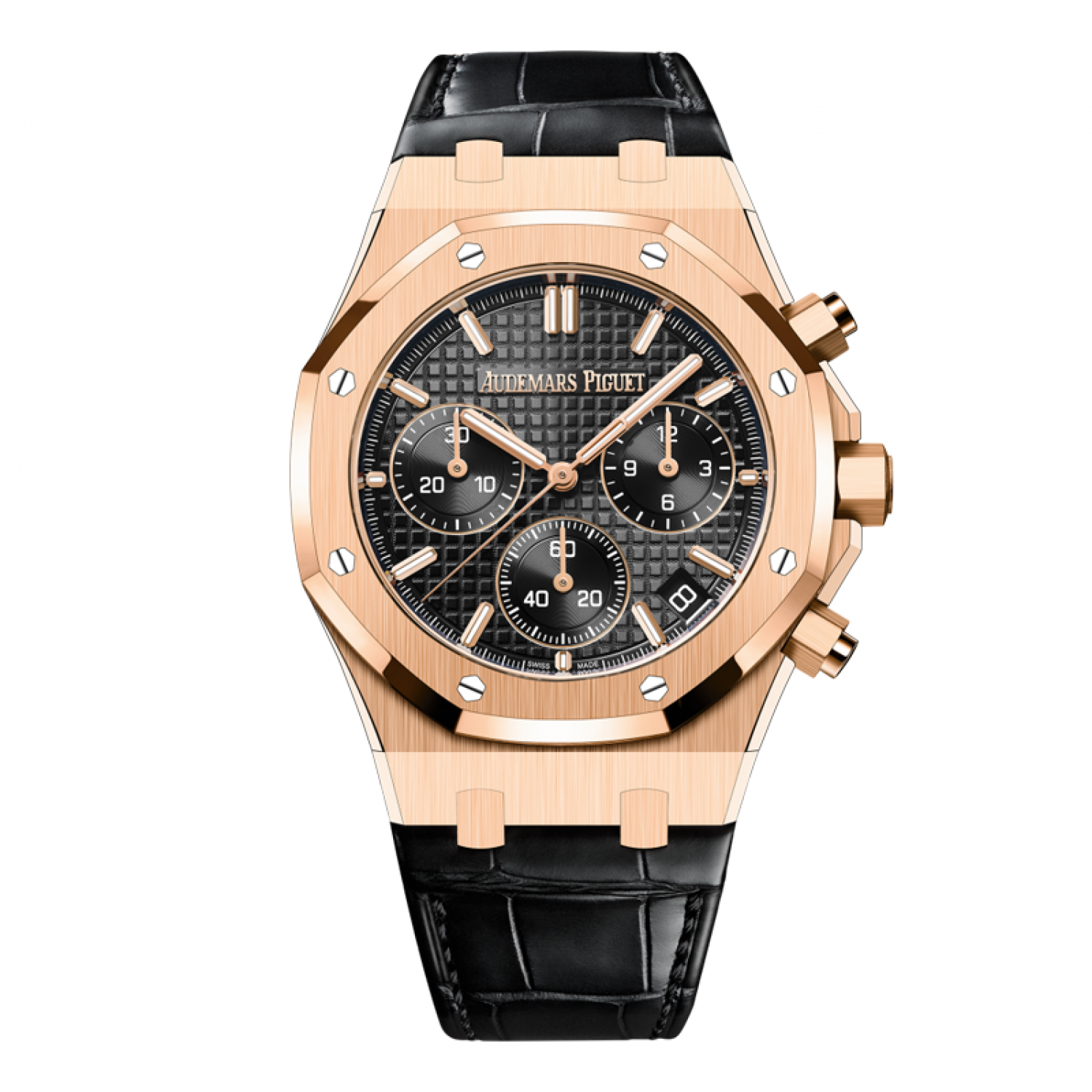 Mặt số màu đen với hoa văn “Grande Tapisserie”, mặt số màu đen, vạch chỉ giờ bằng vàng hồng và kim Royal Oak có lớp phủ phát quang.