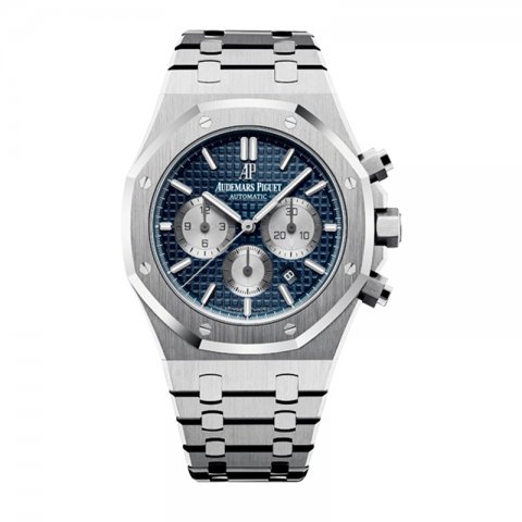 Màu mặt số : Mặt số màu xanh lam với hoa văn “Grande Tapisserie”, mặt số tông màu rhodium, vạch chỉ giờ bằng vàng trắng và kim Royal Oak có lớp phủ phát quang