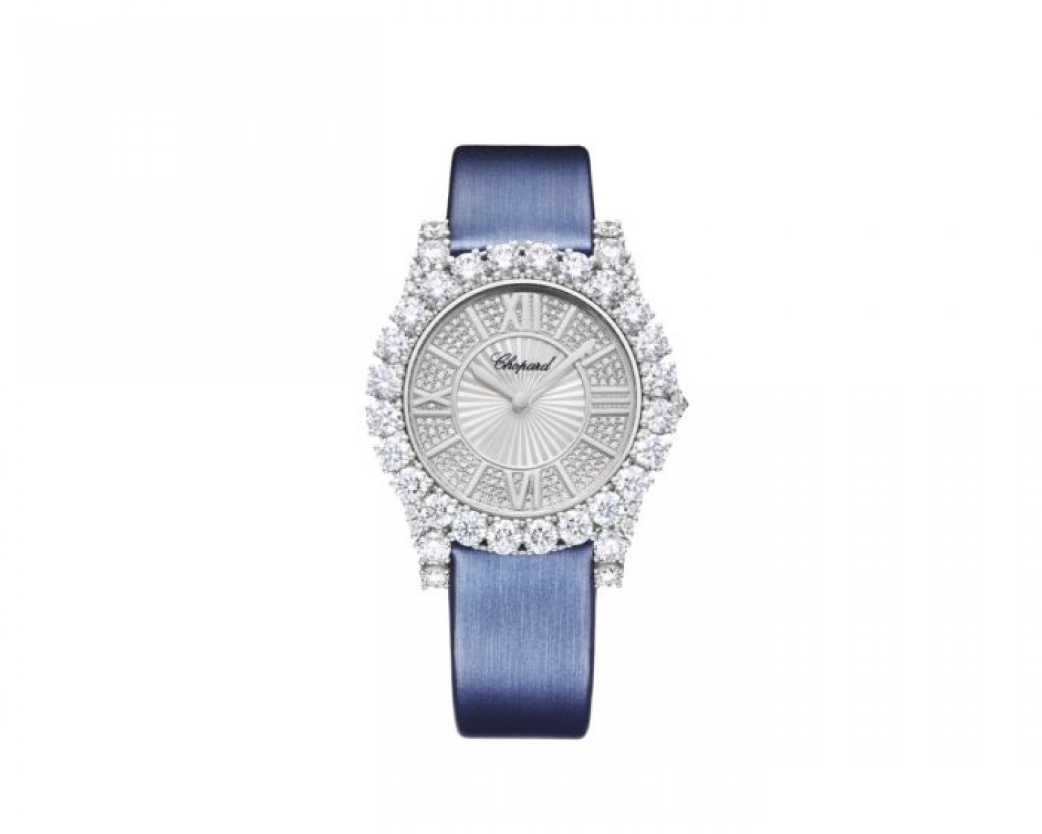Đồng hồ Chopard L'Heure Du Diamant Mặt dây tròn 35,75 mm. Tham khảo mẫu: 139419-1401. Vỏ bằng vàng trắng 18K đính kim cương. Mặt số khảm kim cương và xà cừ Guilloche. Chuyển động tự động. Dây đeo sa tanh màu xanh và khóa chốt bằng vàng trắng 18K.