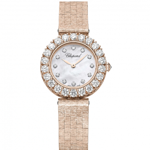 Vỏ bằng vàng hồng 18k có đường kính 26,00 mm, đính kim cương, mặt số xà cừ, mặt tròn l'heure du diamant nhỏ, đường kính 26,00 mm. Vỏ bằng vàng hồng 18k và vòng đeo tay bằng vàng hồng 18k có khóa gập. chuyển động cơ học lên dây bằng tay, dự trữ năng lượng khoảng 30 giờ, dây đeo bằng vàng hồng 18k