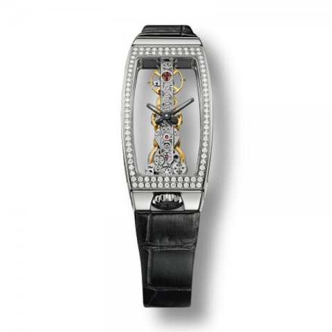 Mặt sau: Vặn nắp sau mở bằng vàng trắng 18k với mặt kính sapphire chống chói