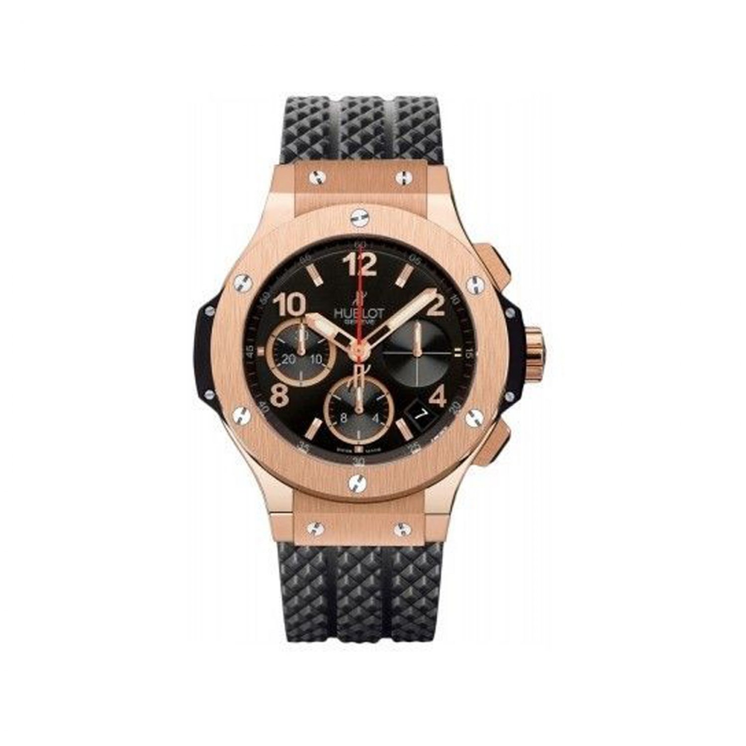 Hublot Big Bang vàng 41mm. Vỏ tròn 41mm bằng Vàng hồng 18K. Viền cũng bằng Vàng hồng 18k với 6 ốc vít màu bạc. Mặt số màu đen với các mặt số phụ bấm giờ ở vị trí 9 và 6 giờ và kim giây trung tâm màu đỏ; mặt số phụ giây nhỏ ở vị trí 3 giờ; hiển thị ngày ở vị trí 4 giờ. Dây đeo cao su màu đen có khóa gập bằng nút nhấn. Bộ chuyển động bấm giờ tự lên dây HUB 4300 với khả năng dự trữ năng lượng 42 giờ.