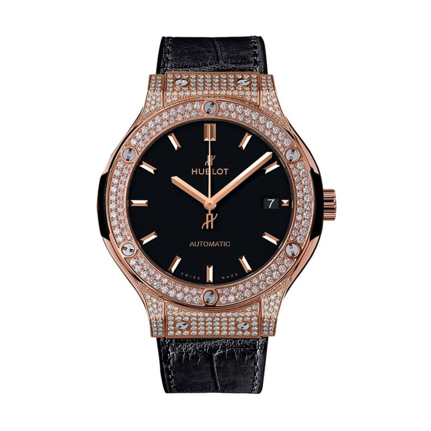 Viền được cố định bằng 6 ốc vít titan kiểu chữ “H” được đánh bóng. Vương miện bằng vàng hồng 18kt được đánh bóng nguyên khối có khắc logo Hublot.