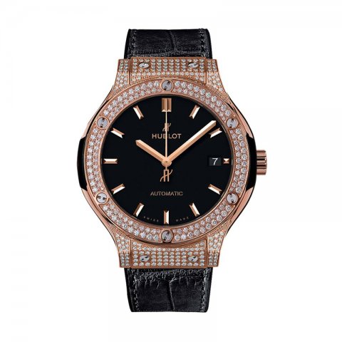 Viền được cố định bằng 6 ốc vít titan kiểu chữ “H” được đánh bóng. Vương miện bằng vàng hồng 18kt được đánh bóng nguyên khối có khắc logo Hublot.