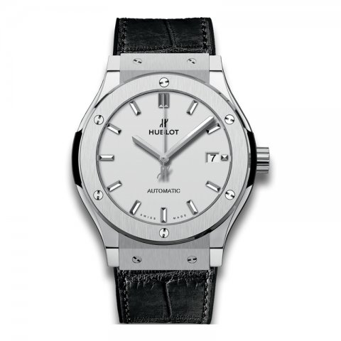 Vỏ titan được đánh bóng và phủ satin với dây đeo bằng da cá sấu màu đen.