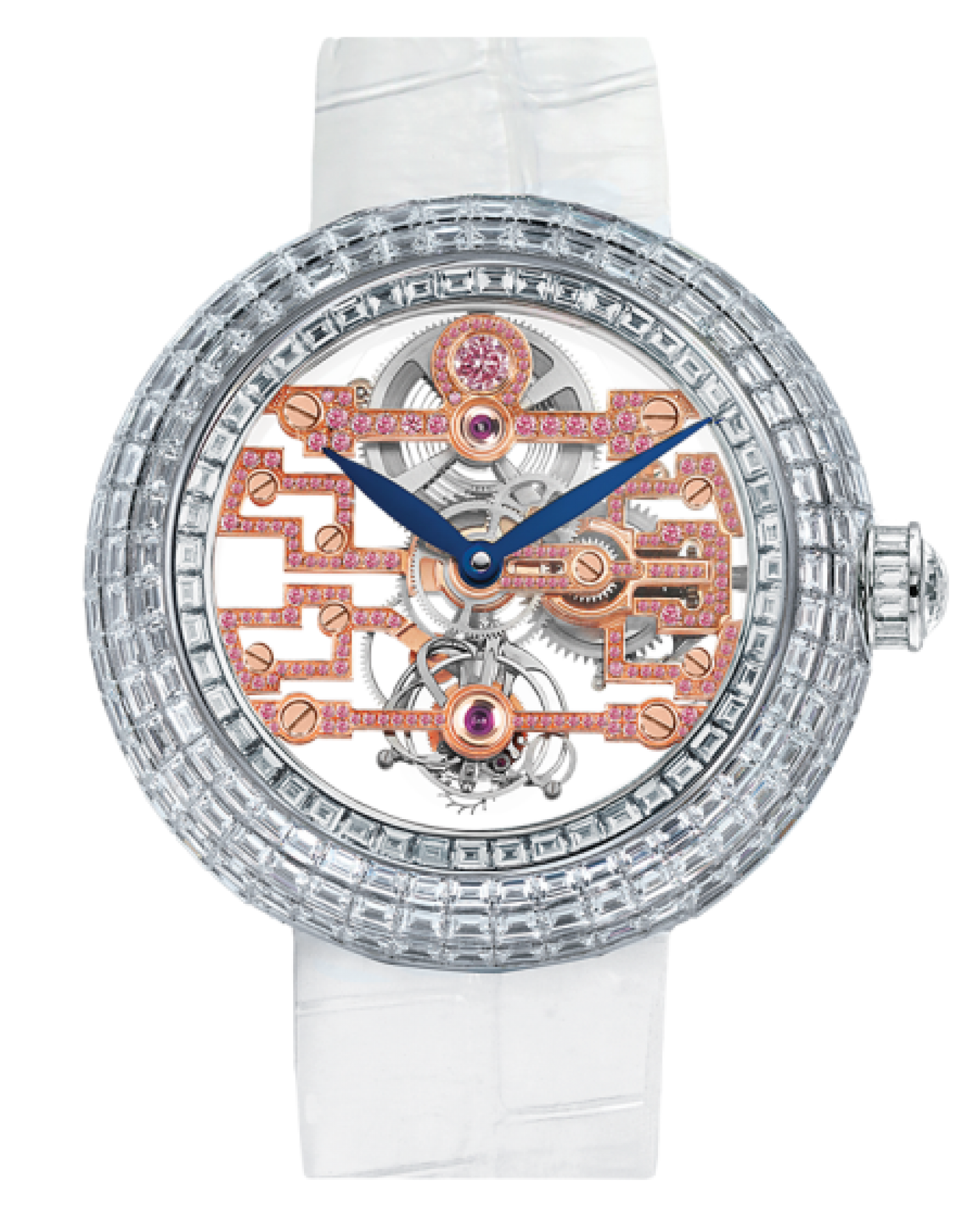 HOÀN THÀNH: Bộ máy mở với tấm sapphire và cầu nối kim cương tinh xảo: 178 viên kim cương màu hồng lạ mắt được cắt sáng chói (≈ 0,61ct.); Các góc được đánh bóng bằng tay.