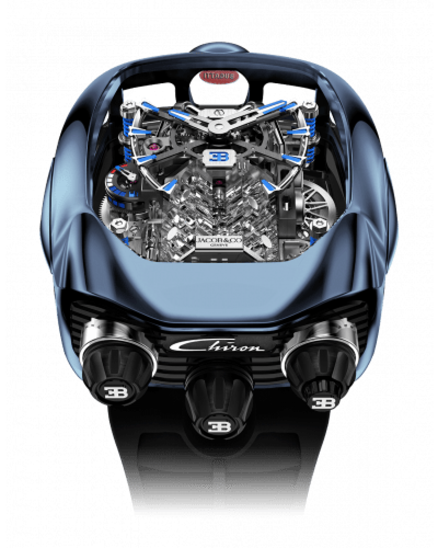 Sản xuất Jacob&Co. Cuộn dây bằng tay JCAM37; Kích thước: 41,7x36mm; Chiều cao: 15,60mm; Thành phần: 578; Đồ trang sức: 51; Hệ thống chống sốc: Incabloc; Dự trữ năng lượng: 60h; Tần số: 21'600 rung/h (3Hz); Trang trí: Blue Sapphire trên Tourbillon; Chức năng: 1. Giờ, Phút; 2. Lồng Tourbillon 1 phút nghiêng 30°; 3. "Động cơ W16" trong khối sapphire 4. Hoạt hình theo yêu cầu (bộ đẩy bên phải) tạo ra chuyển động quay của piston và trục khuỷu; 5. Chỉ báo dự trữ năng lượng ở vị trí 9 giờ.
