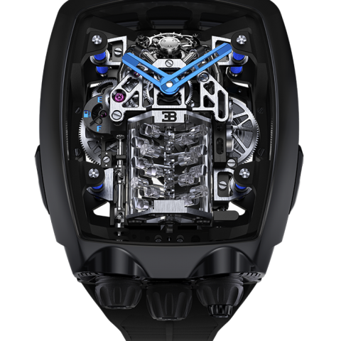 1. Giờ, Phút; 2. Lồng Tourbillon 1 phút nghiêng 30°; 3. “Động cơ W16” trong khối sapphire; 4. Hoạt hình theo yêu cầu (bộ đẩy bên phải) tạo chuyển động quay của piston và trục khuỷu; 5. Đèn báo dự trữ năng lượng ở vị trí 3 giờ