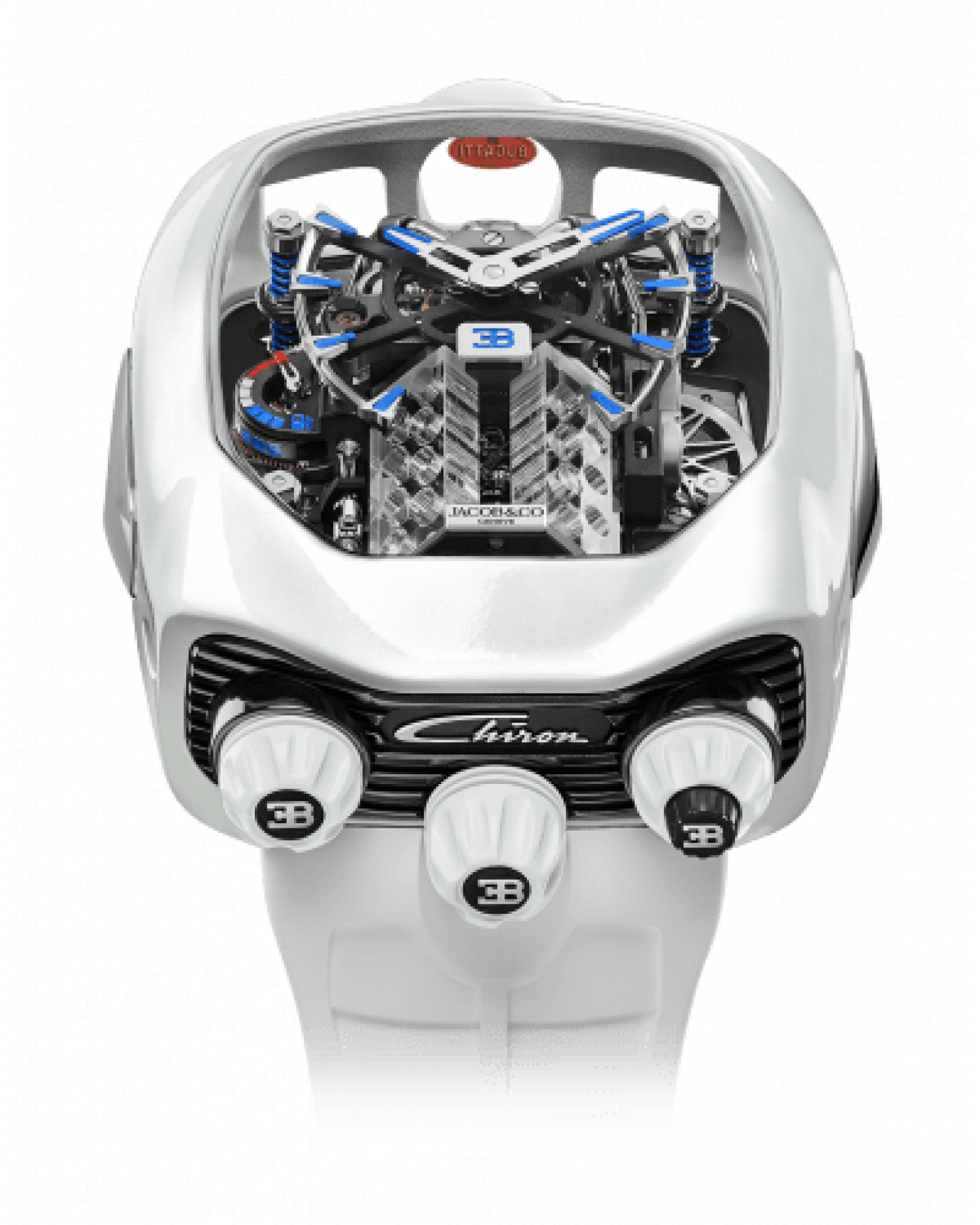 Sản xuất Jacob&Co. Cuộn dây bằng tay JCAM37; Kích thước: 41,7x36mm; Chiều cao: 15,60mm; Thành phần: 578; Đồ trang sức: 51; Hệ thống chống sốc: Incabloc; Dự trữ năng lượng: 60h; Tần số: 21'600 rung/h (3Hz); Chức năng: 1. Giờ, Phút; 2. Lồng Tourbillon 1 phút nghiêng 30°; 3. "Động cơ W16" trong khối sapphire; 4. Hoạt hình theo yêu cầu (bộ đẩy bên phải) tạo chuyển động quay của piston và trục khuỷu; 5. Chỉ báo dự trữ năng lượng ở vị trí 9 giờ.
