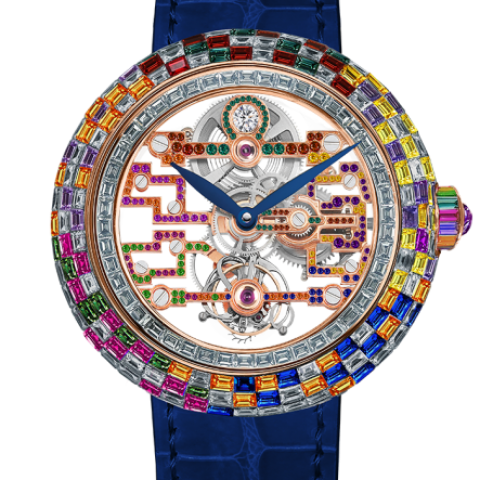 HOÀN THÀNH: Bộ chuyển động mở với các tấm sapphire và các cầu nối được thiết kế tinh xảo: 177 viên sapphire nhiều màu cắt Brilliant (≈ 1,92 ct.) và Một viên kim cương cắt Brilliant (≈ 0,10 ct.) ; Các góc được đánh bóng bằng tay.