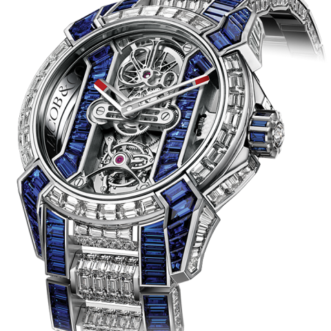 CỠ CHUYỂN ĐỘNG: Bộ máy lên dây thủ công độc quyền Jacob & Co. JCAM03 Calibre; Bánh xe cân bằng thùng và Tourbillon được căn chỉnh theo chiều dọc.
