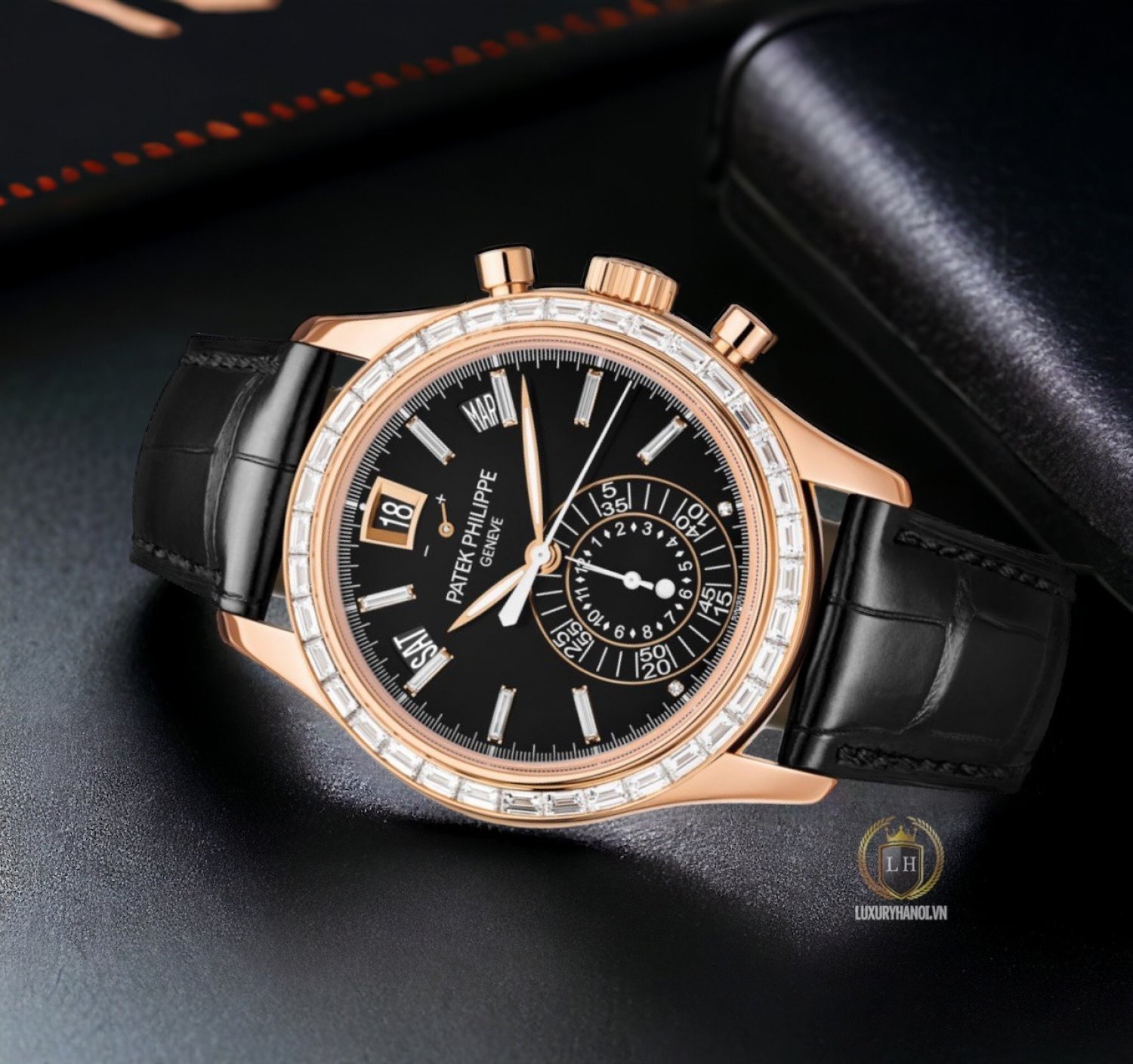 • Chất liệu thân đồng hồ: Làm bằng vàng hồng nguyên khối