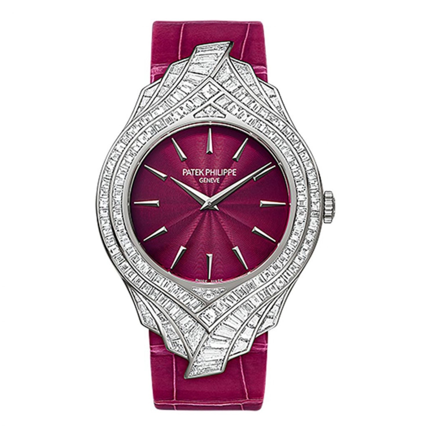 Chất liệu vỏ: Vỏ bằng vàng trắng 18K được đính 162 viên kim cương baguette theo kiểu xếp nếp (~ 5,20 ct)
