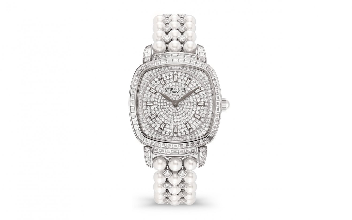 Vành bezel và vấu được đính 78 viên kim cương baguette (~2,33 ct), mặt bích mặt số được đính 108 viên kim cương (~0,33 ct). Mặt số: được đính 251 viên kim cương (~0,73 ct) đặt theo hình tròn và 12 vạch chỉ giờ bằng kim cương cắt hình thang (~0,14 ct). Vương miện đính cabochon ngọc trai Akoya. Bộ vòng tay với 78 viên ngọc trai Akoya (~48,85 ct) và các mắt xích trang trí bằng vàng trắng được đính 48 viên kim cương cắt kiểu công chúa (~2,28 ct). Bộ kẹp gấp được đính 55 viên kim cương (~0,23 ct). Tổng số 552 viên kim cương: ~6,04 ct.