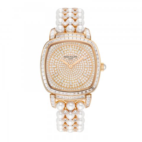 Vành bezel và vấu được đính 78 viên kim cương baguette (~2,33 ct), mặt bích mặt số được đính 108 viên kim cương (~0,33 ct). Mặt số: được đính 251 viên kim cương (~0,73 ct) đặt theo hình tròn và 12 vạch chỉ giờ bằng kim cương cắt hình thang (~0,14 ct). Vương miện đính cabochon ngọc trai Akoya. Bộ vòng tay với 78 viên ngọc trai Akoya (~48,85 ct) và các mắt xích trang trí bằng vàng hồng được đính 48 viên kim cương cắt kiểu công chúa (~2,28 ct). Bộ kẹp gấp được đính 55 viên kim cương (~0,23 ct). Tổng số 552 viên kim cương: ~6,04 ct.