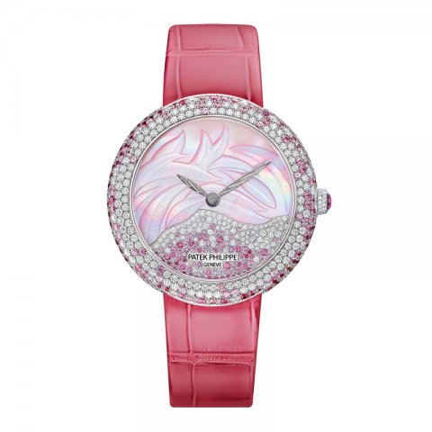 Màu mặt số : Bộ mặt số xà cừ được chạm khắc với 98 viên kim cương và 89 viên ngọc bích màu hồng