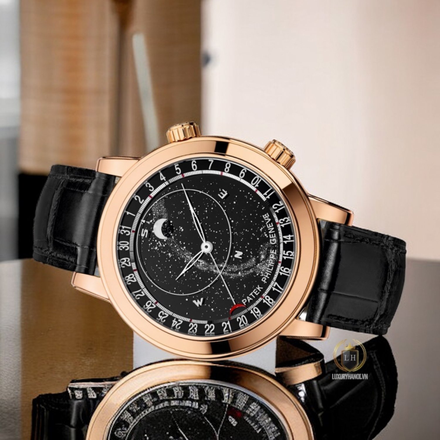 Chuyển động cơ học tự lên dây. Caliber 240 LU CL C. Ngày. Giờ và phút của thời gian mặt trời trung bình. Biểu đồ bầu trời, các pha và quỹ đạo của Mặt trăng. Thời gian đi qua kinh tuyến của Sirius và mặt trăng. Đĩa tinh thể sapphire màu xanh lam cho nền trời và tuần trăng.