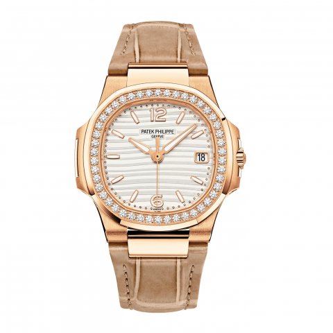 Dây đeo: cá sấu sáng bóng có vảy vuông, màu be. Khóa gập Nautilus.