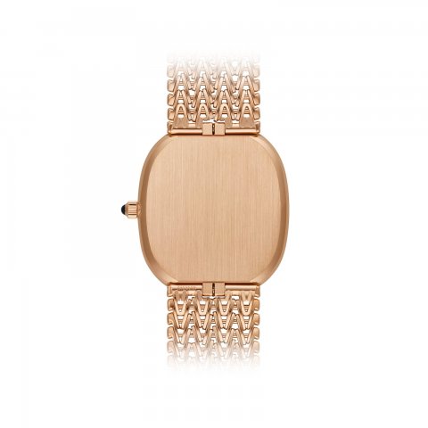 Vàng hồng . Vòng đeo tay kiểu dây chuyền bằng vàng hồng được đánh bóng hoàn toàn bao gồm 363 chi tiết, trong đó có hơn 300 mắt xích được gắn riêng lẻ bằng tay. Khóa gấp được chạm khắc bằng vàng hồng với ba vị trí điều chỉnh.