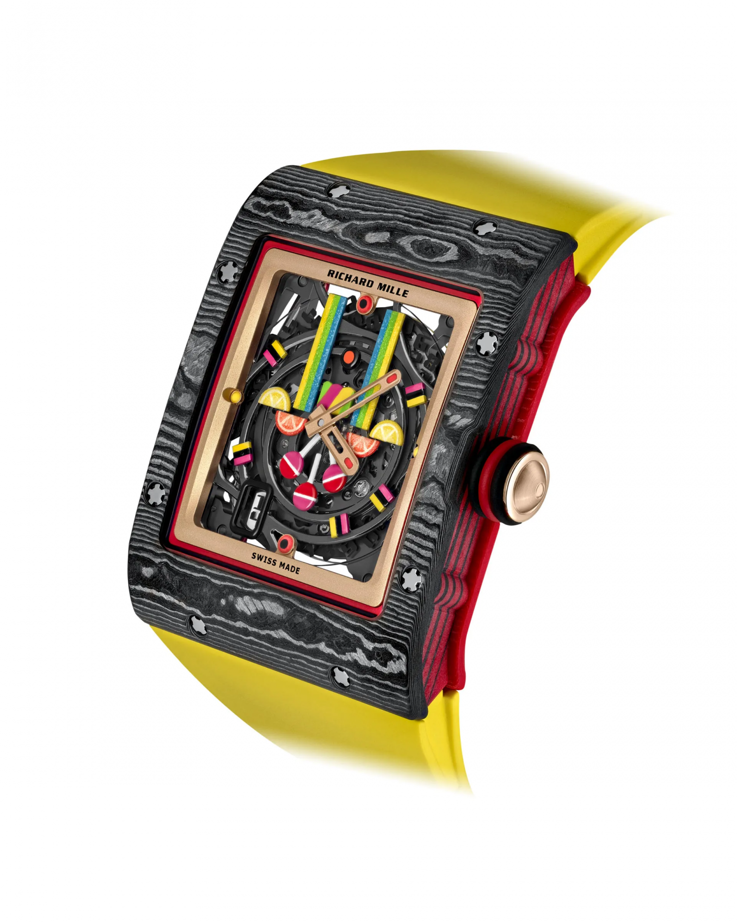 Viền trước của RM 16-01 Fraise được làm từ Carbon TPT® và mặt sau của nó sử dụng Quartz TPT® màu đỏ. Dây đeo sử dụng dải màu chuyển màu của Carbon TPT®/Thạch anh đỏ TPT®, tạo ra sự chuyển đổi màu sắc trang nhã từ viền sang vỏ sau. Mặt số bằng titan cấp 5 được xử lý Titalyt® màu xám. Mỗi viên kẹo được sơn bằng sơn acrylic và sơn mài bằng tay với một chút hiệu ứng đường.
