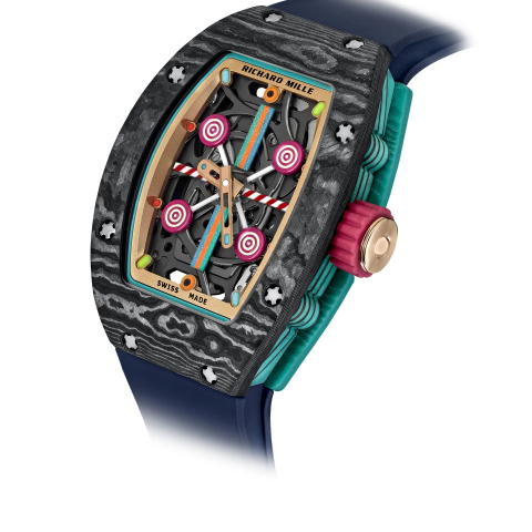 Viền trước của RM 07-03 Myrtille được làm từ Carbon TPT® và mặt sau của nó sử dụng Quartz TPT® màu ngọc lam mới. Dây đeo sử dụng dải màu chuyển màu của Carbon TPT® /turquoise Quartz TPT®, tạo ra sự chuyển đổi màu sắc trang nhã từ viền sang vỏ sau. Mặt số bằng titan cấp 5 được xử lý Titalyt® màu xám. Mỗi viên kẹo được sơn bằng sơn acrylic và sơn mài bằng tay với một chút hiệu ứng đường.