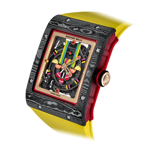 Viền trước của RM 16-01 Fraise được làm từ Carbon TPT® và mặt sau của nó sử dụng Quartz TPT® màu đỏ. Dây đeo sử dụng dải màu chuyển màu của Carbon TPT®/Thạch anh đỏ TPT®, tạo ra sự chuyển đổi màu sắc trang nhã từ viền sang vỏ sau. Mặt số bằng titan cấp 5 được xử lý Titalyt® màu xám. Mỗi viên kẹo được sơn bằng sơn acrylic và sơn mài bằng tay với một chút hiệu ứng đường.
