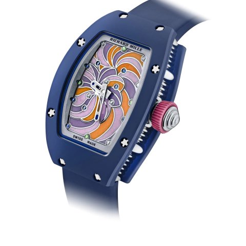 Richard Mille đã chuyển sang sử dụng gốm sứ màu mới cho viền và vỏ sau RM 07-03 Cupcake: gốm TZP màu xanh đậm và xanh da trời. Dây đeo được làm bằng vàng trắng được thổi vi mô và đánh bóng bằng tay. Mặt số bằng titan và vàng trắng cấp 5, được tráng men thủ công bằng đá tsavorite, kim cương và ngọc bích.