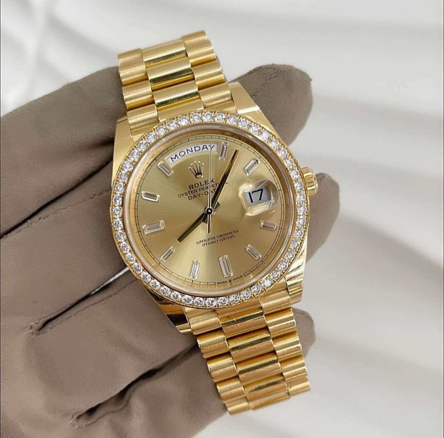 Đồng Hồ Rolex Day-Date Vàng Kim Mặt Số Màu sâm Panh Nạm Kim Cương 228348RBR