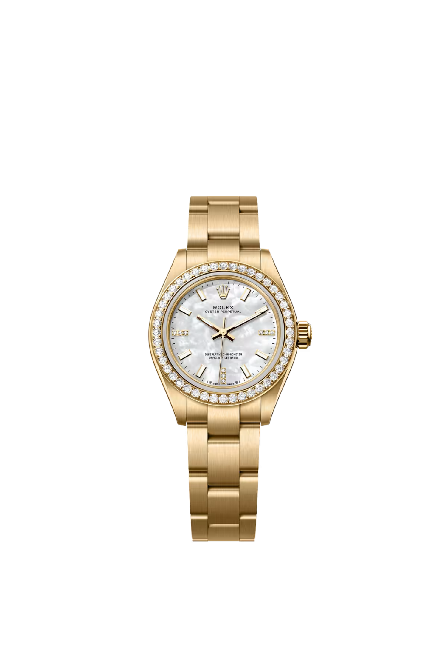 Các vạch dấu giờ bằng vàng 18 ct ở vị trí 3, 6 và 9 giờ, được đính 9 viên kim cương