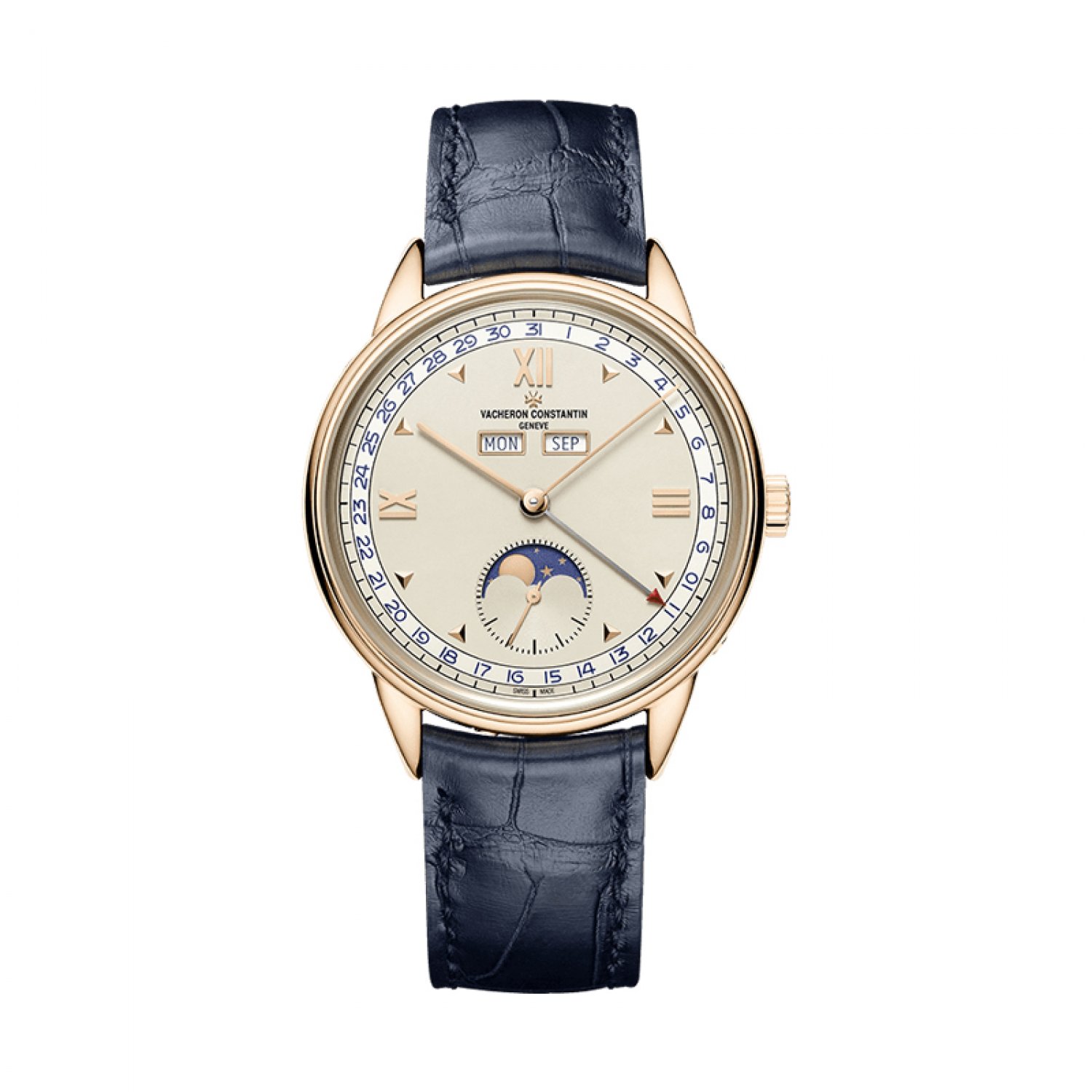 Chỉ định: giờ, phút, tháng ở khẩu độ, ngày kiểu kim, giây nhỏ ở vị trí 6 giờ, ngày trong tuần ở khẩu độ