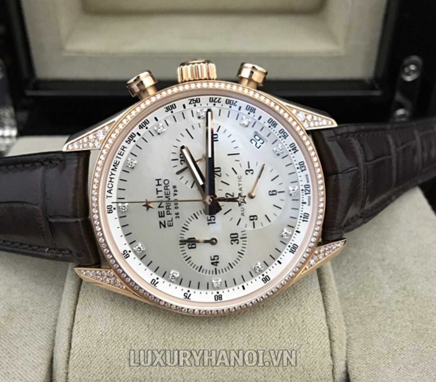 - Núm chỉnh giờ: Làm bằng vàng nguyên khối và khắc nổi logo Zenith