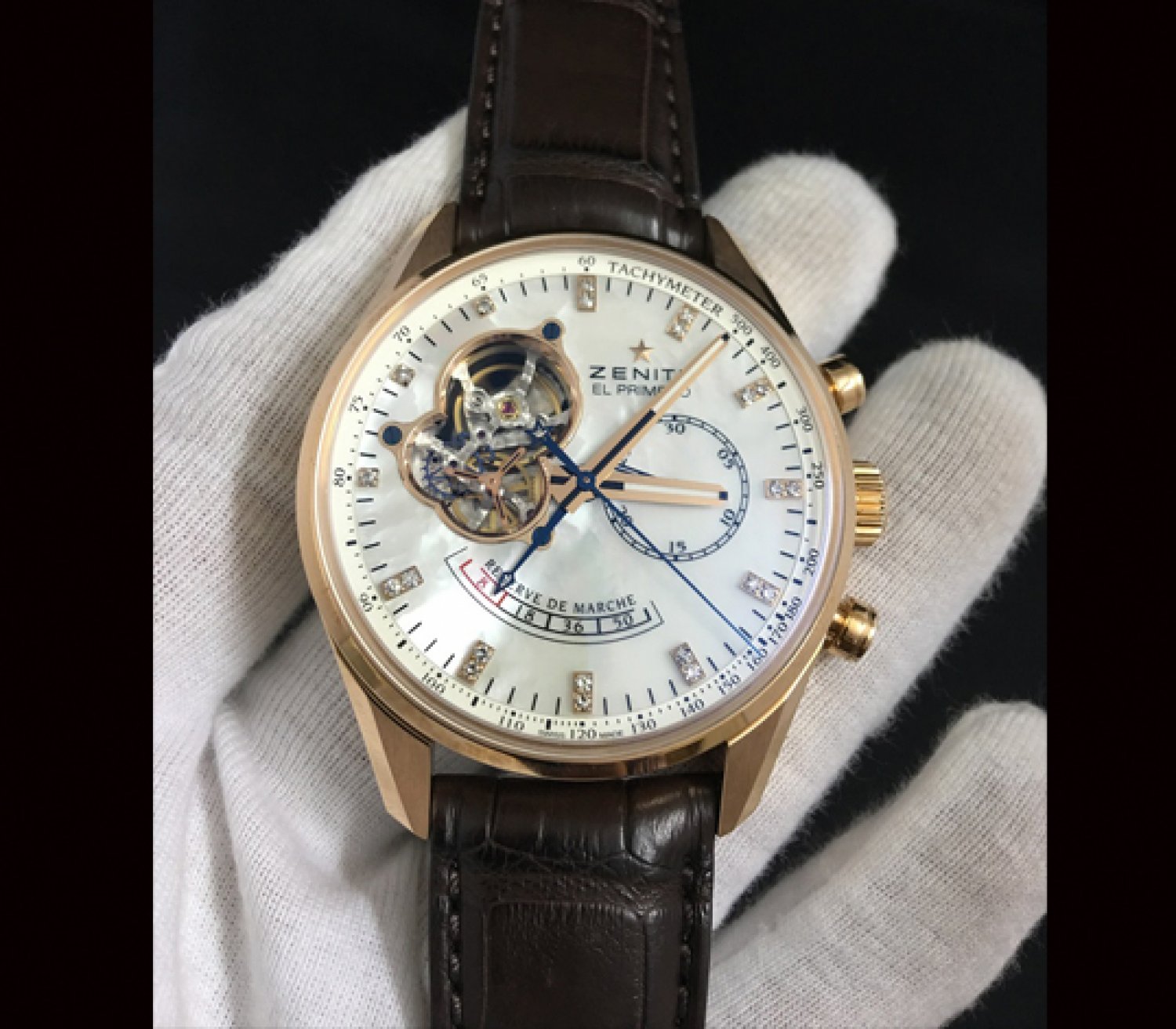 - Núm chỉnh giờ: Làm bằng vàng hồng nguyên khối và khắc nổi logo Zenith