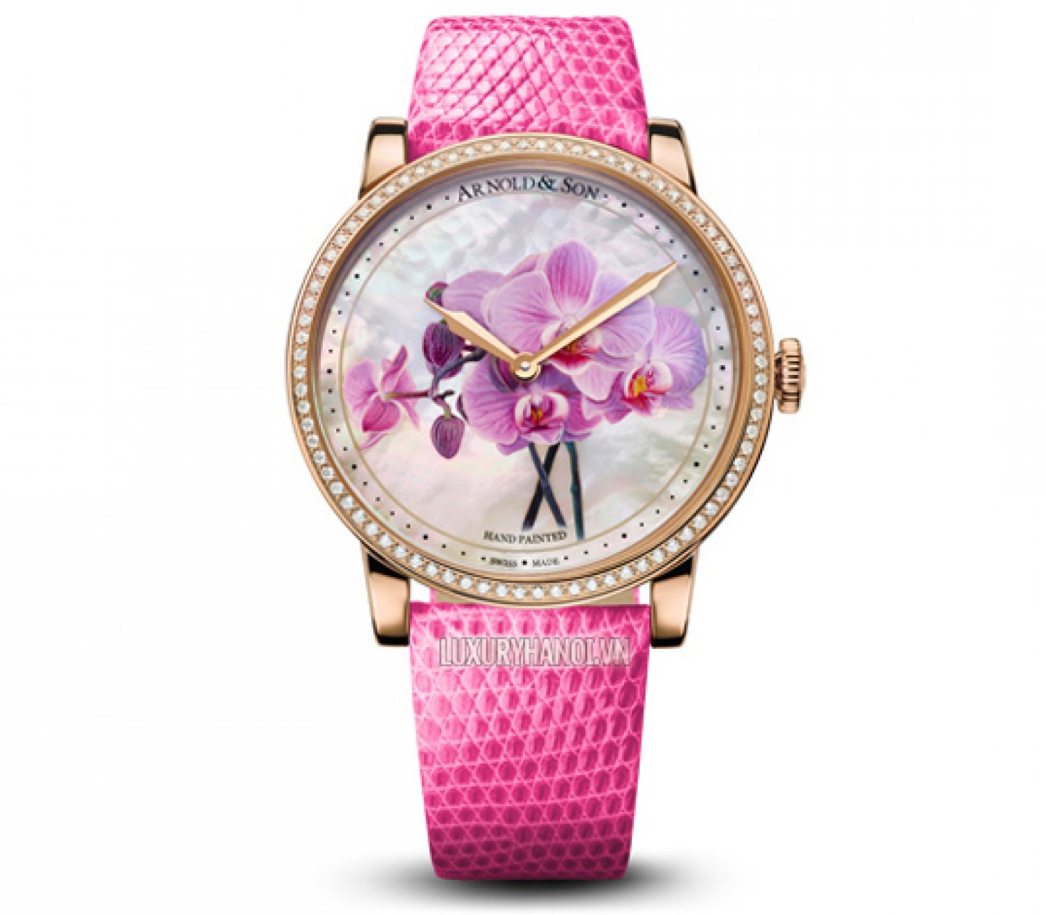 - Chất liệu thân đồng hồ: vàng hồng nguyên khối 18k