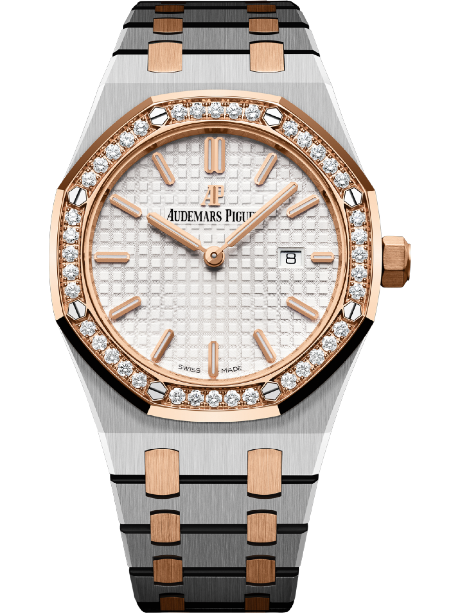 Mặt đồng hồ tông màu bạc có hoa văn “Grande Tapisserie”, vạch chỉ giờ màu vàng hồng và kim Royal Oak có lớp phủ phát quang.