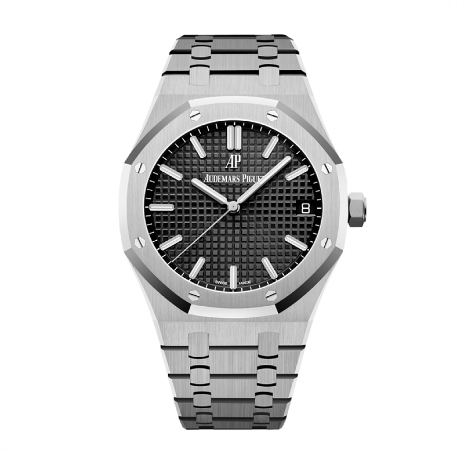 Mặt số màu đen có hoa văn “Grande Tapisserie”, vạch chỉ giờ bằng vàng trắng và kim Royal Oak phủ phát quang.