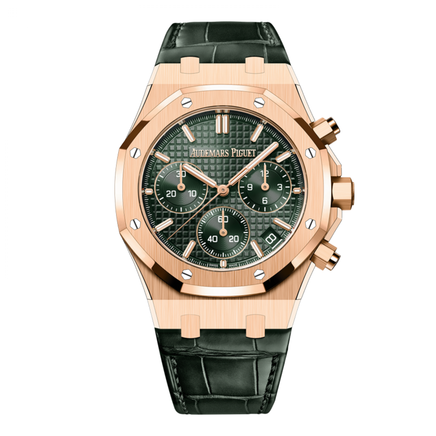 Mặt số màu kaki màu xanh lá cây có hoa văn “Grande Tapisserie”, mặt số màu xanh lá cây, vạch chỉ giờ bằng vàng hồng và kim Royal Oak có lớp phủ phát quang.