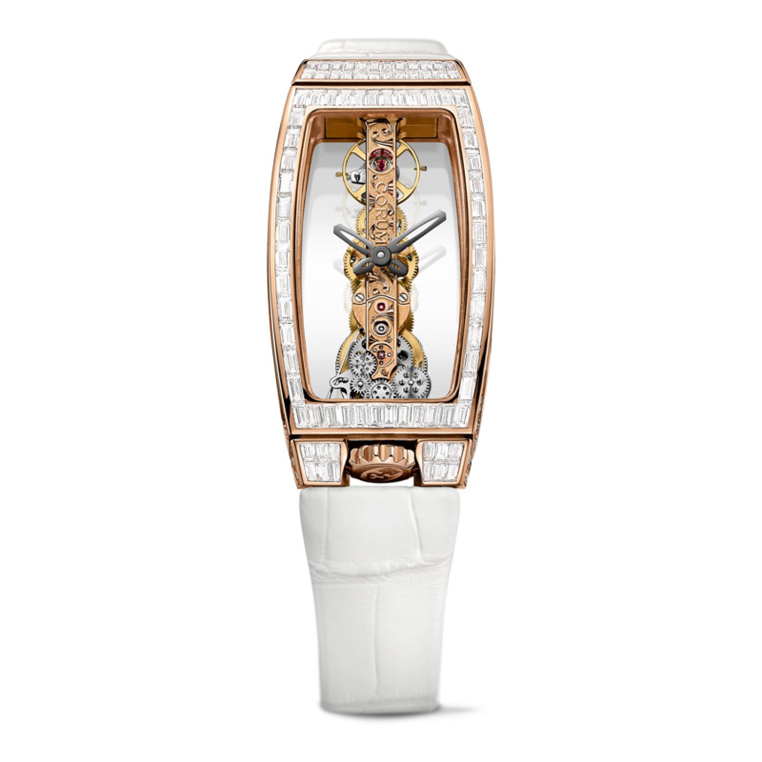 * Viền vàng hồng 18K, mặt số lộ cơ với hai kim màu xám được gắn khéo léo trên cây cầu chạy từ vị trí 12 giờ đến vị trí 6 giờ