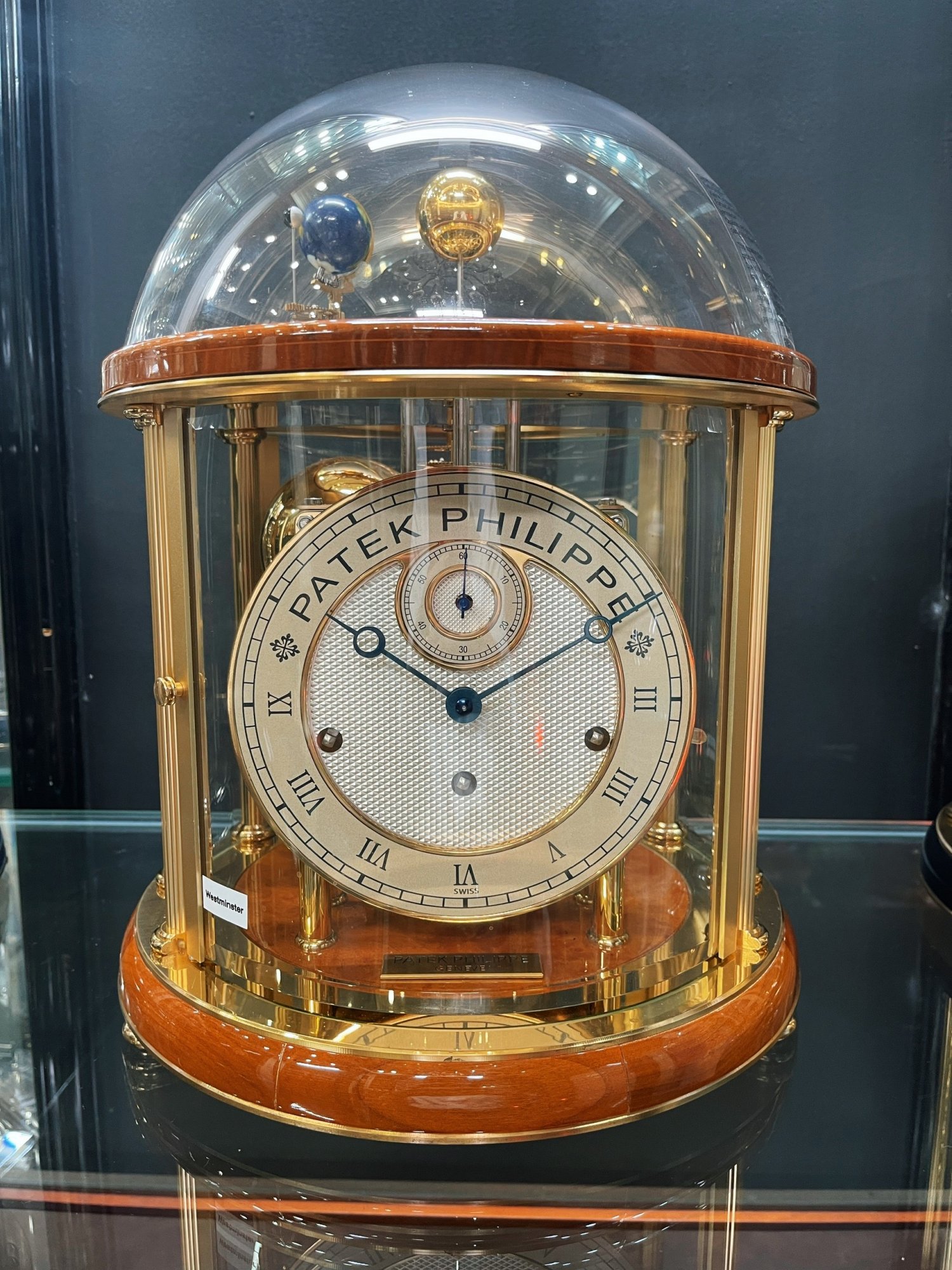 This Patek Philippe display clock by Franz Hermle features an 8 day mechanical movement, 365 day moonphase, and rotating Moon, Earth and Sun. It also has a repeater function that strikes the time each quarter, half and three quarter hour via the 4 bells. This is all displayed under a hand blown sapphire crystal exhibition cover. This clock measures 35cm in height, and 30cm in diameter. Our Xupes reference is should you need to quote this.