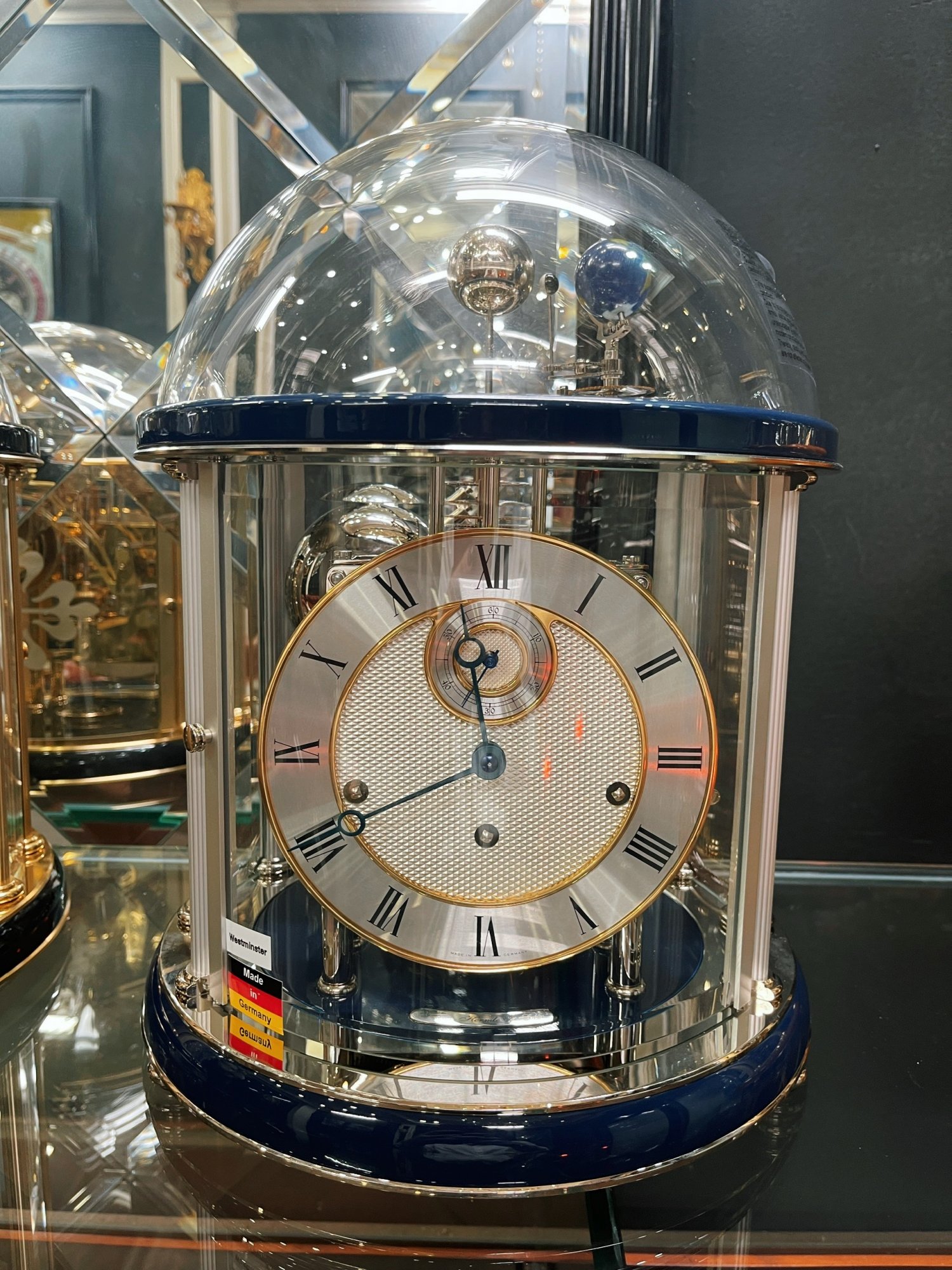 This Patek Philippe display clock by Franz Hermle features an 8 day mechanical movement, 365 day moonphase, and rotating Moon, Earth and Sun. It also has a repeater function that strikes the time each quarter, half and three quarter hour via the 4 bells. This is all displayed under a hand blown sapphire crystal exhibition cover. This clock measures 35cm in height, and 30cm in diameter. Our Xupes reference is should you need to quote this.