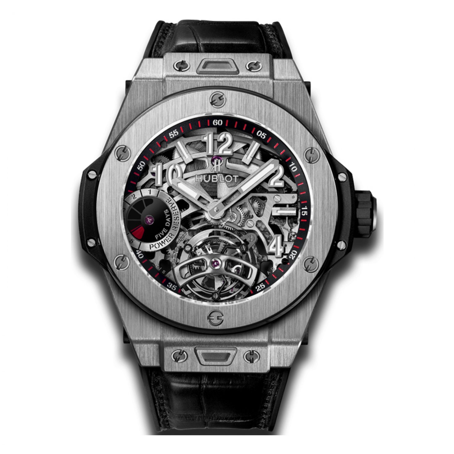 Vỏ titan được đánh bóng và hoàn thiện bằng sa tanh 45 mm, viền titan được đánh bóng và hoàn thiện bằng sa tanh, viền dưới bằng nhựa tổng hợp màu đen với 6 ốc vít titan hình chữ H, mặt kính sapphire được xử lý chống phản chiếu và logo Hublot được in ở mặt trong, mặt số sapphire với đồ trang trí mạ rhodium hoàn thiện bằng sa-tanh, kim mạ rhodium có viền satin và vi phun, phát quang màu đen trên cả đồ trang trí và kim, bộ chuyển động lên dây cót thủ công do HUB6016 sản xuất với khung tourbillon dự trữ năng lượng, dự trữ năng lượng khoảng 115 giờ, cao su đen và dây đeo cá sấu , khóa triển khai bằng titan có lớp lót bằng titan. Khả năng chống nước đến 30 mét.