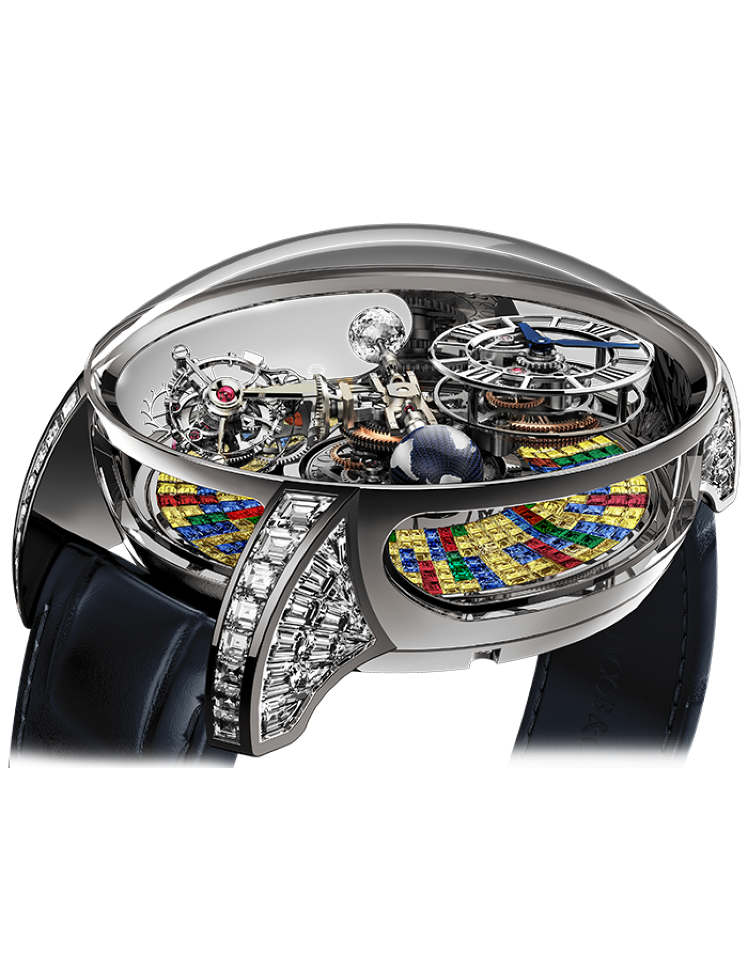 CHỨC NĂNG: Quay số giờ, phút Quay trong 20 phút trên Trục trung tâm, Hệ thống bánh răng vi sai được cấp bằng sáng chế; Viên kim cương hình cầu có mặt quay trong 60 giây trên 2 trục (Trọng lượng: 1 carat; 288 mặt “Jacob Cut”); Quả cầu sơn mài magiê Quay trong 60 giây trên 2 trục; Lồng Tourbillon hấp dẫn Quay trên 3 trục: Trục thứ 1: trong 60 giây, Trục thứ 2: trong 5 phút, Trục thứ 3: Trục giữa trong 20 phút.
