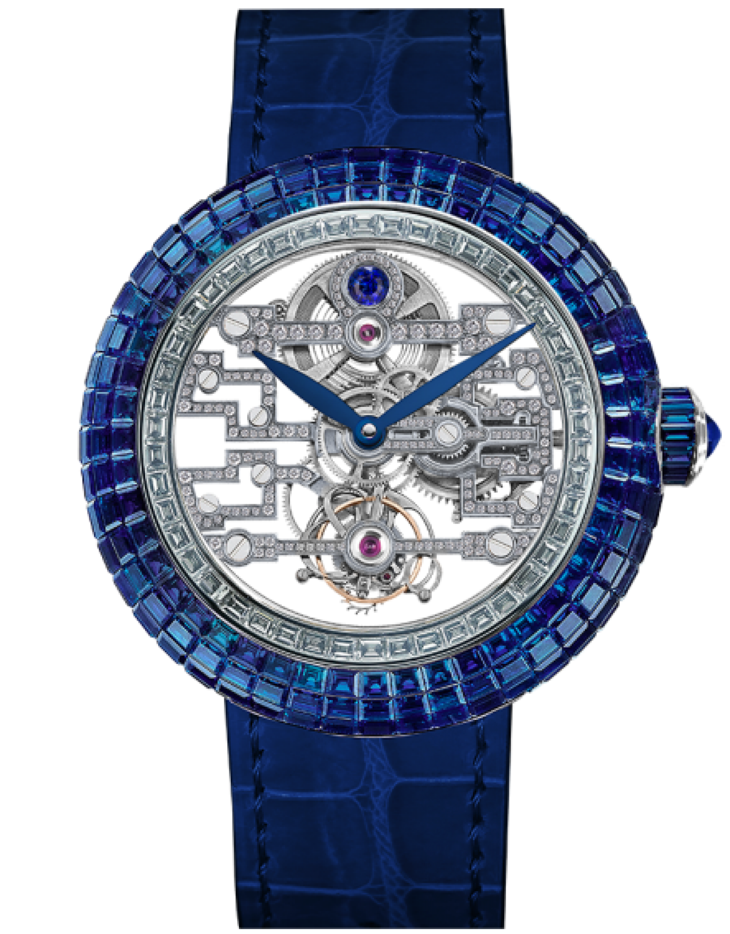 HOÀN THIỆN: Bộ chuyển động mở với tấm sapphire và cầu nối tinh xảo: 171 viên kim cương trắng cắt Brilliant (≈ 0,56 ct.) và một viên Sapphire xanh cắt Brilliant (≈ 0,11 ct.); Các góc được đánh bóng bằng tay.