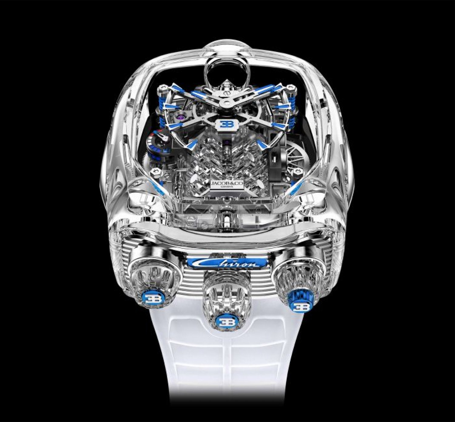 Sản xuất Jacob&Co. Cuộn dây bằng tay JCAM37; Kích thước: 41,7x36mm; Chiều cao: 15,60mm; Thành phần: 578; Đồ trang sức: 51; Hệ thống chống sốc: Incabloc; Dự trữ năng lượng: 60h; Tần số: 21'600 rung/h (3Hz).