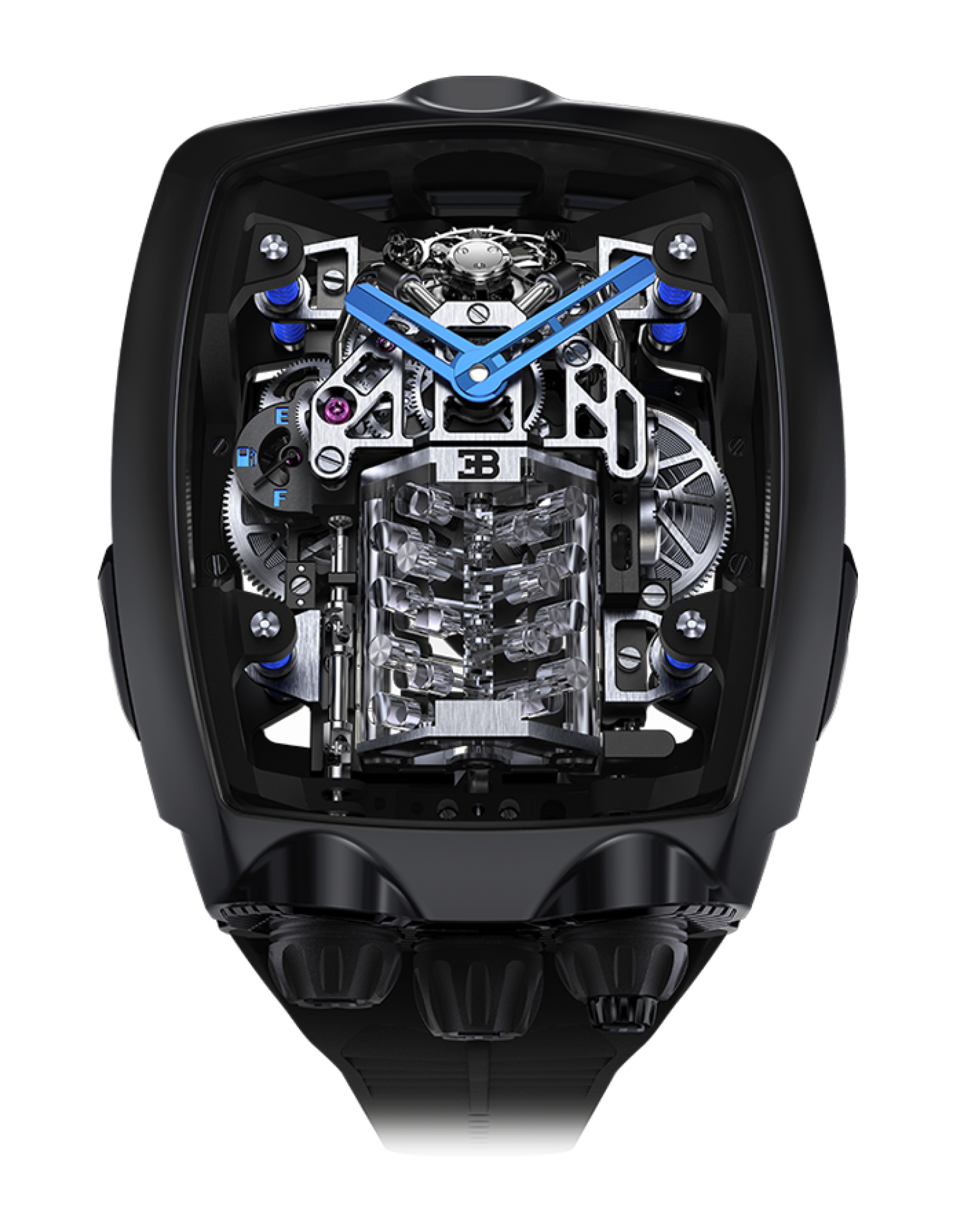 1. Giờ, Phút; 2. Lồng Tourbillon 1 phút nghiêng 30°; 3. “Động cơ W16” trong khối sapphire; 4. Hoạt hình theo yêu cầu (bộ đẩy bên phải) tạo chuyển động quay của piston và trục khuỷu; 5. Đèn báo dự trữ năng lượng ở vị trí 3 giờ