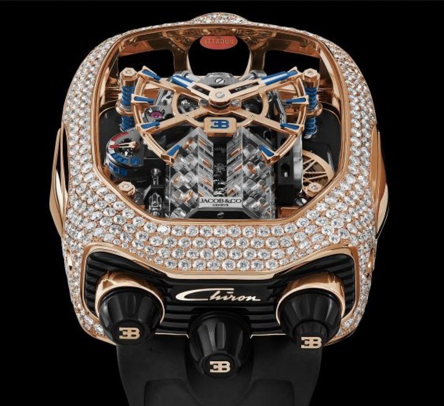 Cỡ nòng: Sản xuất Jacob&Co. Cuộn dây bằng tay JCAM37; Kích thước: 41,7x36mm; Chiều cao: 15,60mm; Thành phần: 578; Đồ trang sức: 51; Hệ thống chống sốc: Incabloc; Dự trữ năng lượng: 60h; Tần số: 21'600 rung/h (3Hz); Trang trí: Blue Sapphire trên Tourbillon; Chức năng: 1. Giờ, Phút; 2. Lồng Tourbillon 1 phút nghiêng 30°; 3. "Động cơ W16" trong khối sapphire 4. Hoạt hình theo yêu cầu (bộ đẩy bên phải) tạo ra chuyển động quay của piston và trục khuỷu; 5. Chỉ báo dự trữ năng lượng ở vị trí 9 giờ.