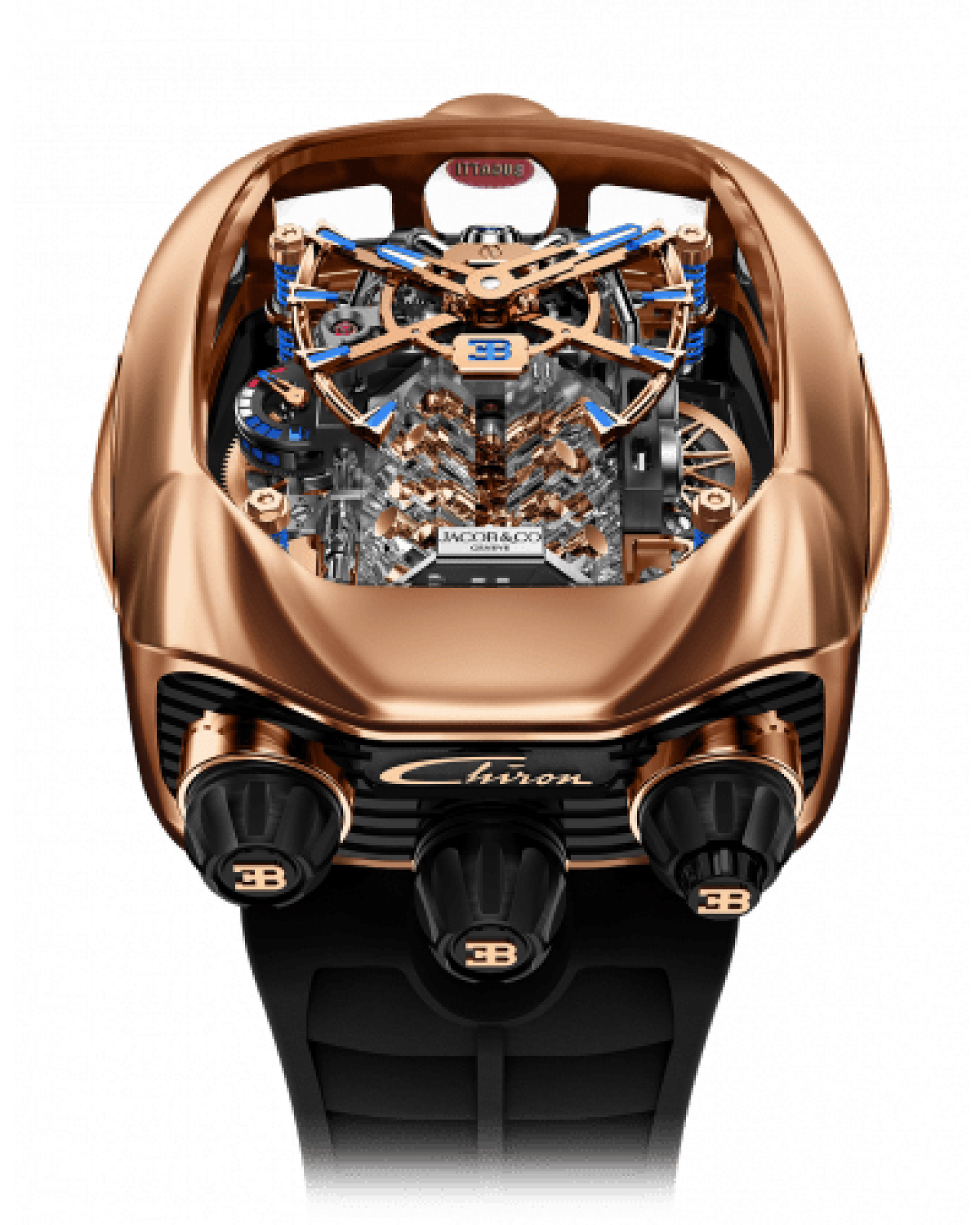 Sản xuất Jacob&Co. Cuộn dây bằng tay JCAM37; Kích thước: 41,7x36mm; Chiều cao: 15,60mm; Thành phần: 578; Đồ trang sức: 51; Hệ thống chống sốc: Incabloc; Dự trữ năng lượng: 60h; Tần số: 21'600 rung/h (3Hz); Trang trí: Blue Sapphire trên Tourbillon; Chức năng: 1. Giờ, Phút; 2. Lồng Tourbillon 1 phút nghiêng 30°; 3. "Động cơ W16" trong khối sapphire 4. Hoạt hình theo yêu cầu (bộ đẩy bên phải) tạo ra chuyển động quay của piston và trục khuỷu; 5. Chỉ báo dự trữ năng lượng ở vị trí 9 giờ.
