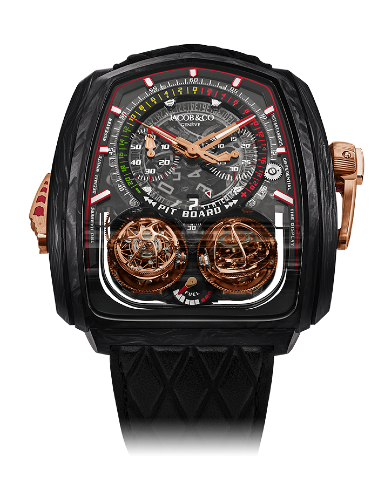 1. Giờ, Phút; Chỉ báo giây nhỏ lúc 9 giờ 2. Đồng hồ bấm giờ Mono-Pusher: Bộ đếm phút lúc 3 giờ, Kim giây chính giữa 3. Thời gian tham chiếu: Phút hiển thị lúc 6 giờ Khẩu độ và Giây hiển thị lúc 12 giờ; Chênh lệch thời gian tham chiếu, được hiển thị bằng kim giây Chronograph trên bảng điều khiển quay số 4. Bộ lặp phút thập phân: Giờ, 10 phút. và phút; 2 búa ở vị trí 12 giờ 5. Tourbillon tốc độ cao tuần tự ba trục đôi 6. Chỉ báo dự trữ năng lượng ở vị trí 6 giờ