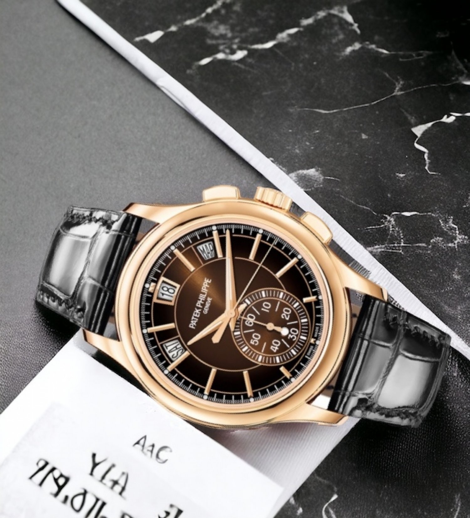 Kết hợp hai tính năng phức tạp của Patek Philippe được những người sành sỏi đánh giá cao – đồng hồ bấm giờ flyback tự lên dây cót và Lịch thường niên đã được cấp bằng sáng chế –, chiếc Ref. 5905 hiện có phiên bản mới với vỏ bằng vàng hồng và mặt số màu nâu ánh nắng, chuyển dần sang màu đen ở viền ngoài.