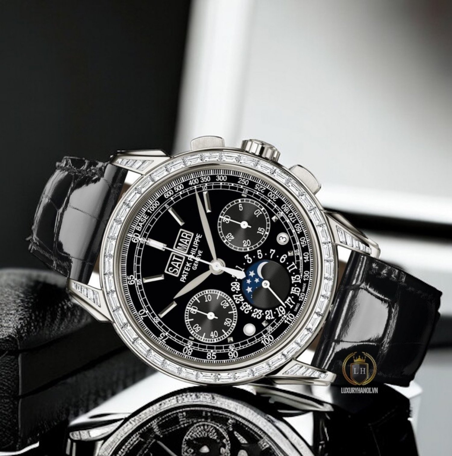 Mặt số: sơn mài màu đen, đánh dấu giờ bằng vàng và 1 viên kim cương baguette ở vị trí 12 giờ.
